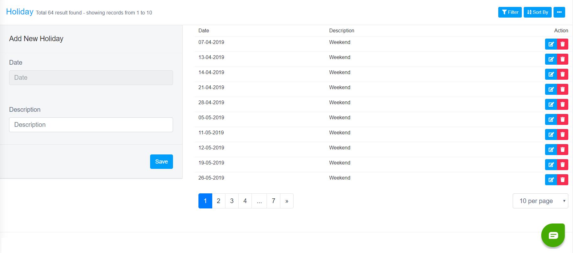 In every row, there are options to show, edit & delete Holiday details.